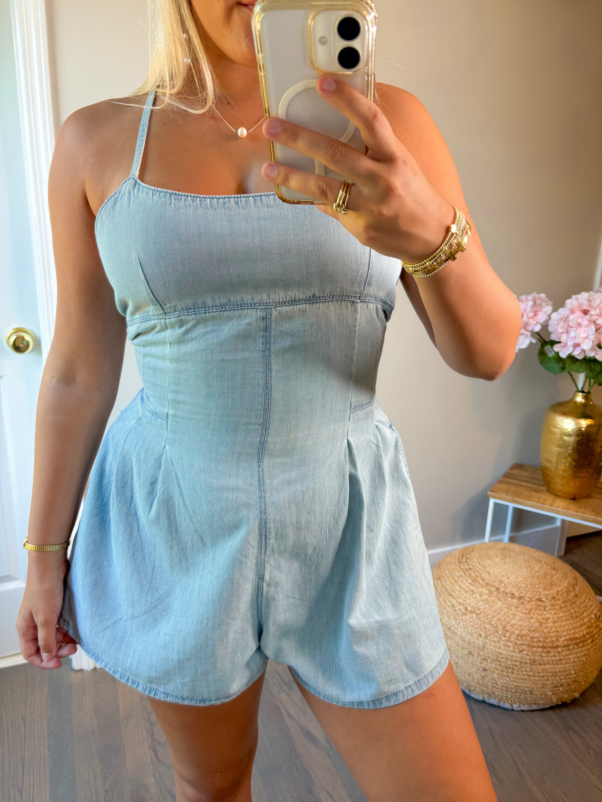 Washed denim romper with spaghetti straps and drawstring ties in back for adjustable straps and tapered waist.