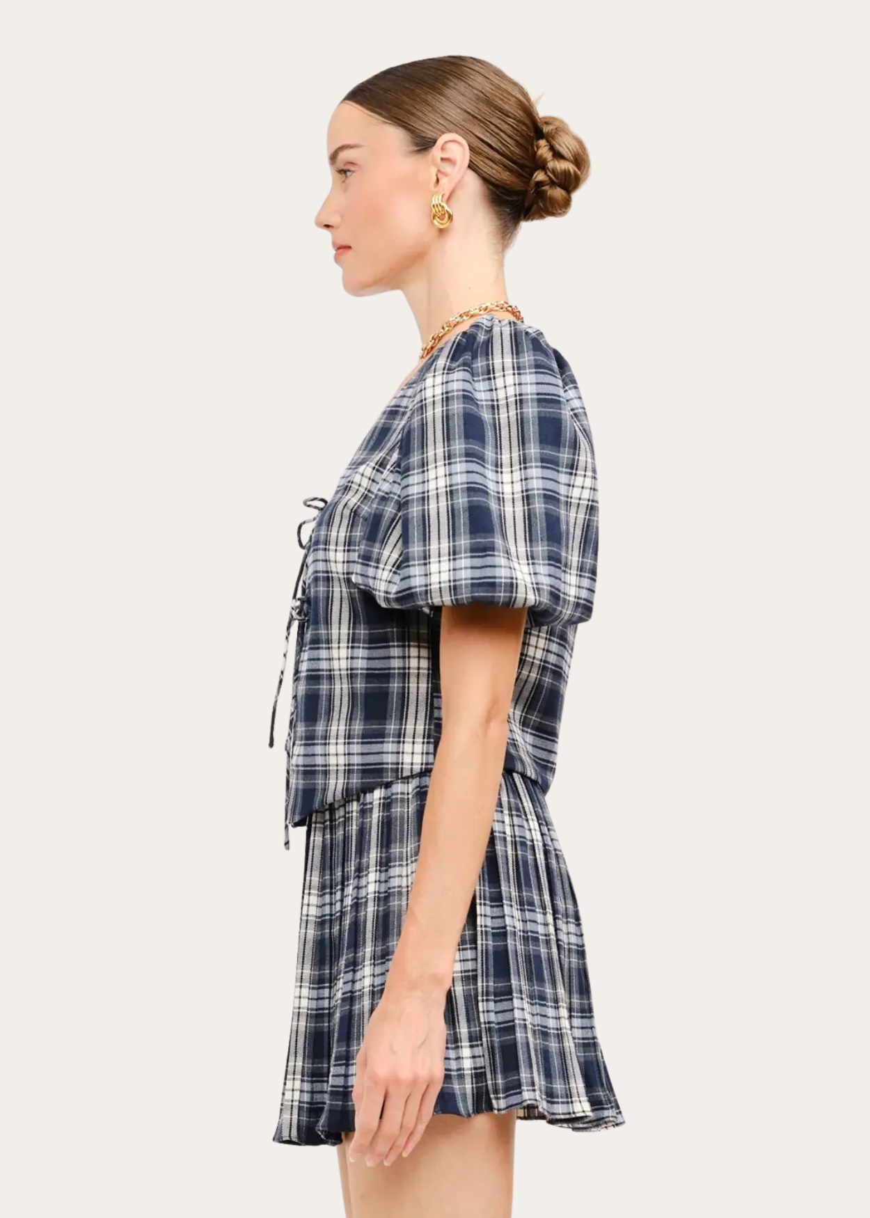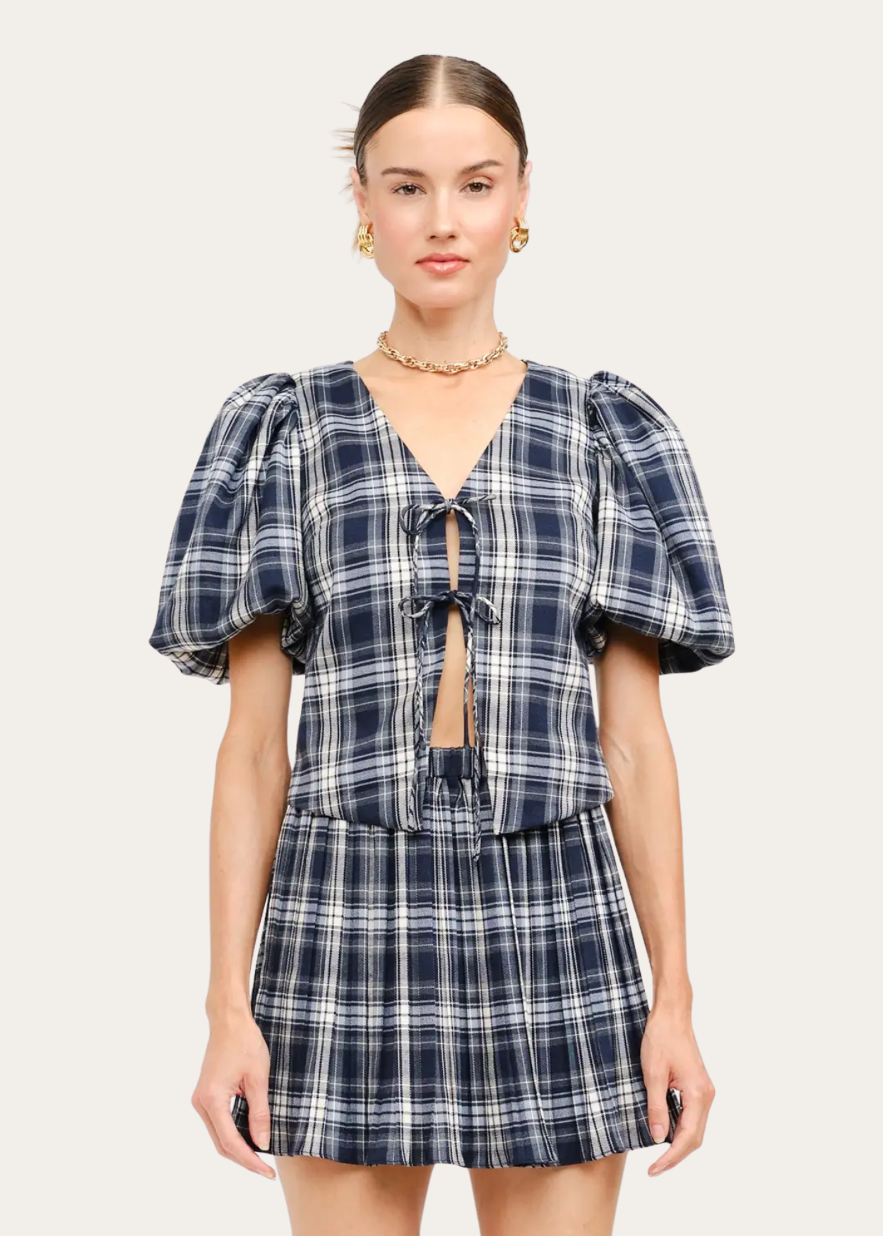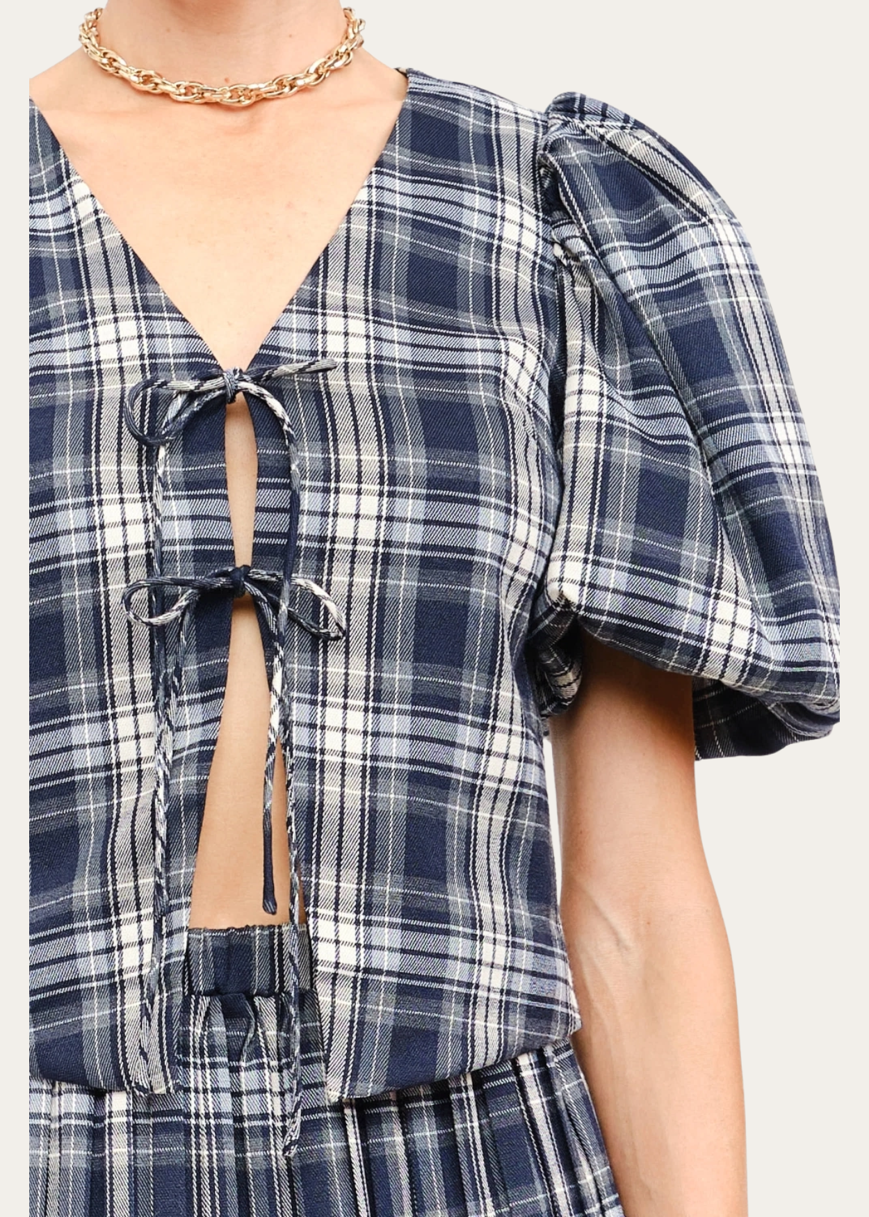 Navy plaid puff sleeve top with front ties.