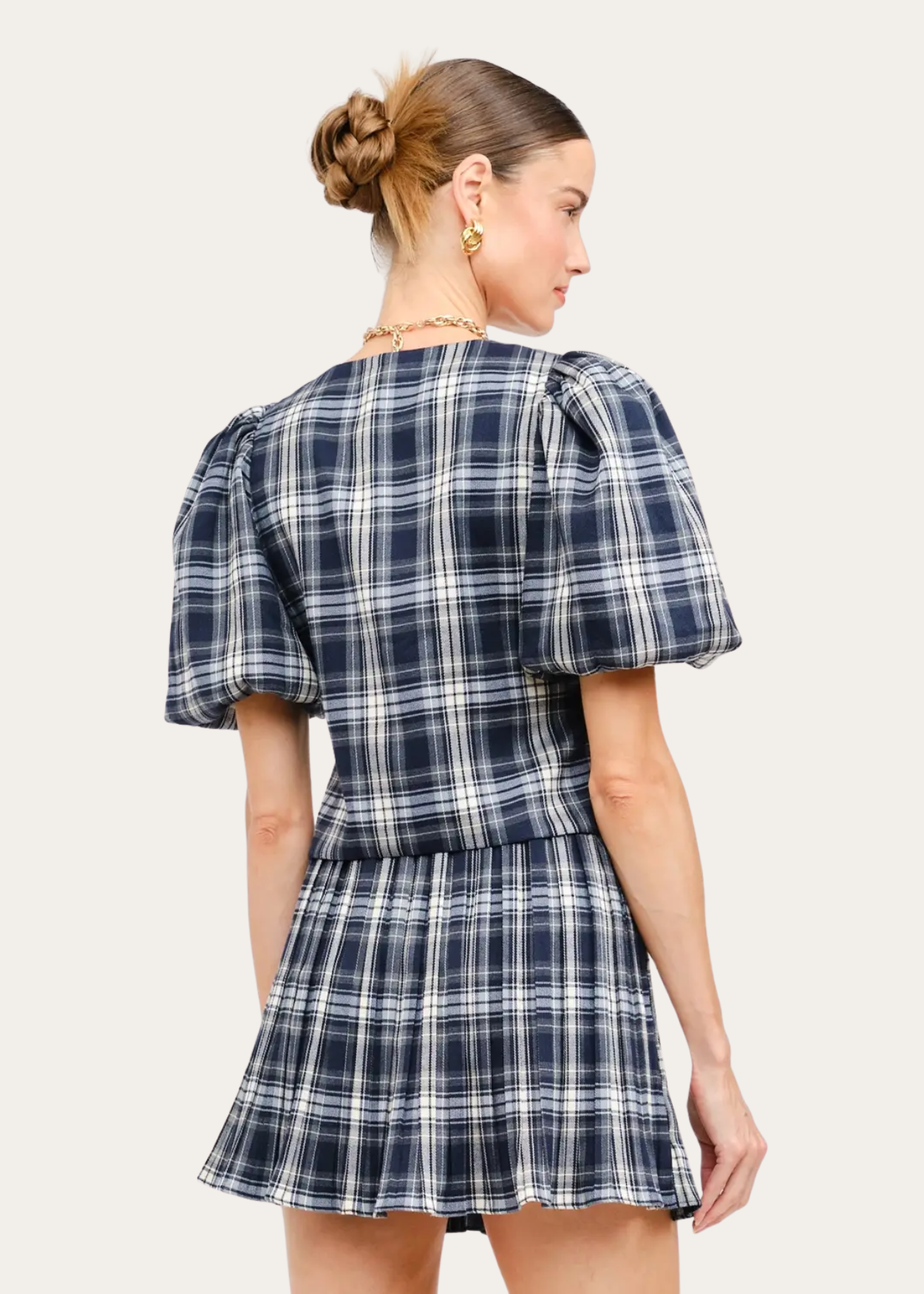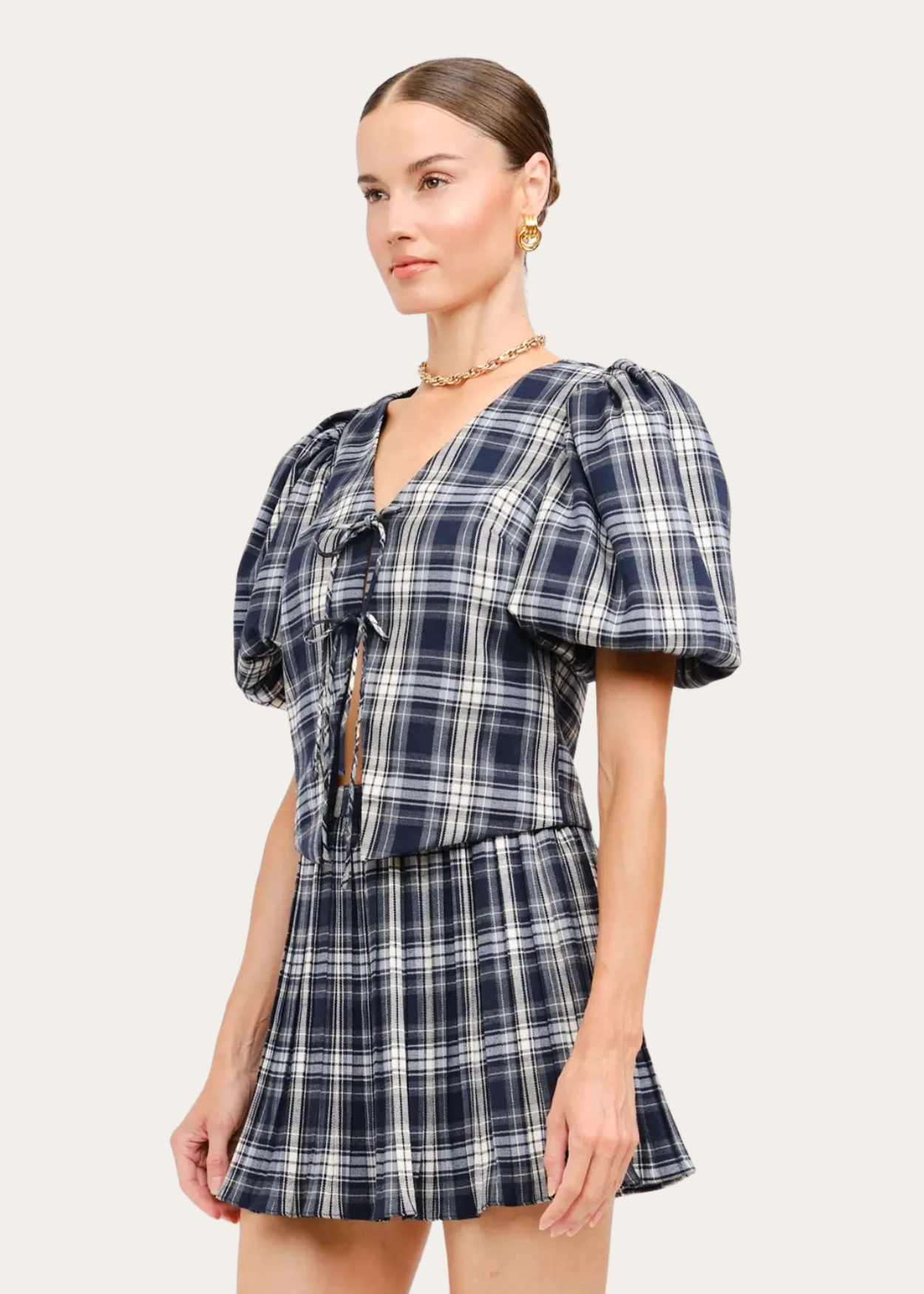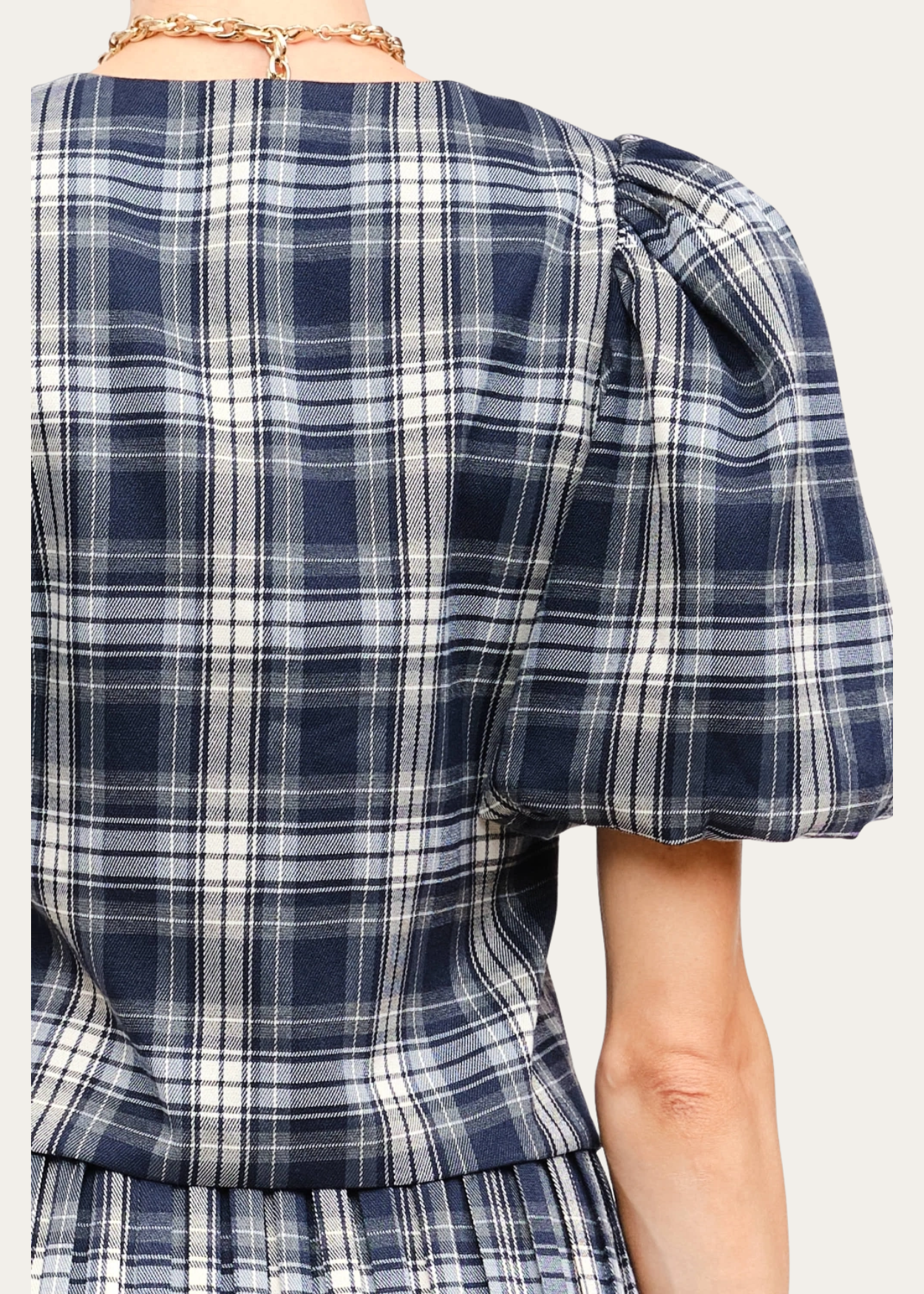 Navy plaid puff sleeve top with front ties.